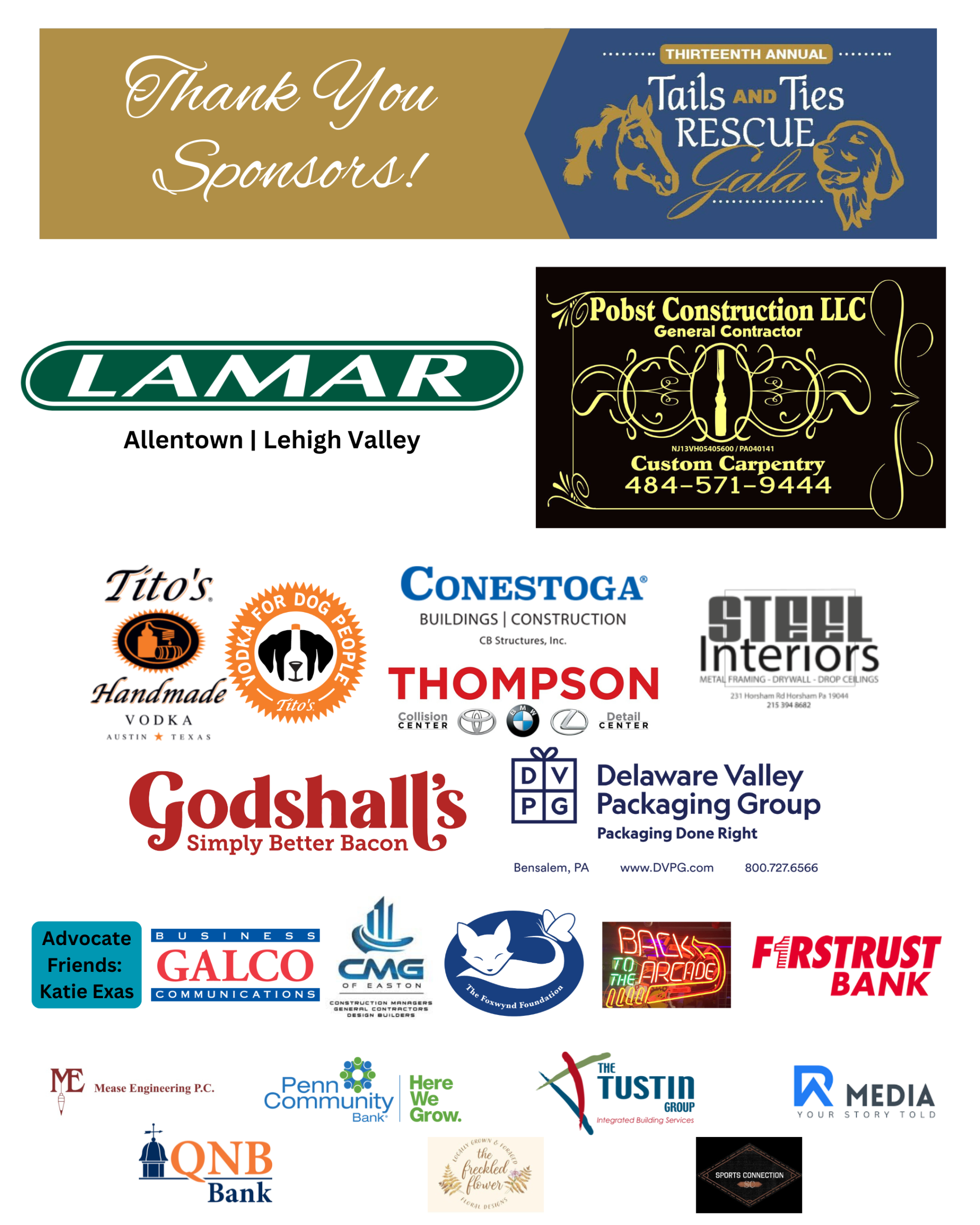 Our Tails & Ties Gala is our biggest event of the year! We are excited for you to join us on Saturday, April 18th, 2026 from 5pm to 10pm at the Centennial Event Center at Homewood Suites- 3350 Center Valley Pkwy, Center Valley, PA. Event Admission includes dinner, open bar, music, dancing, live auction, and bidding on items of your choosing.