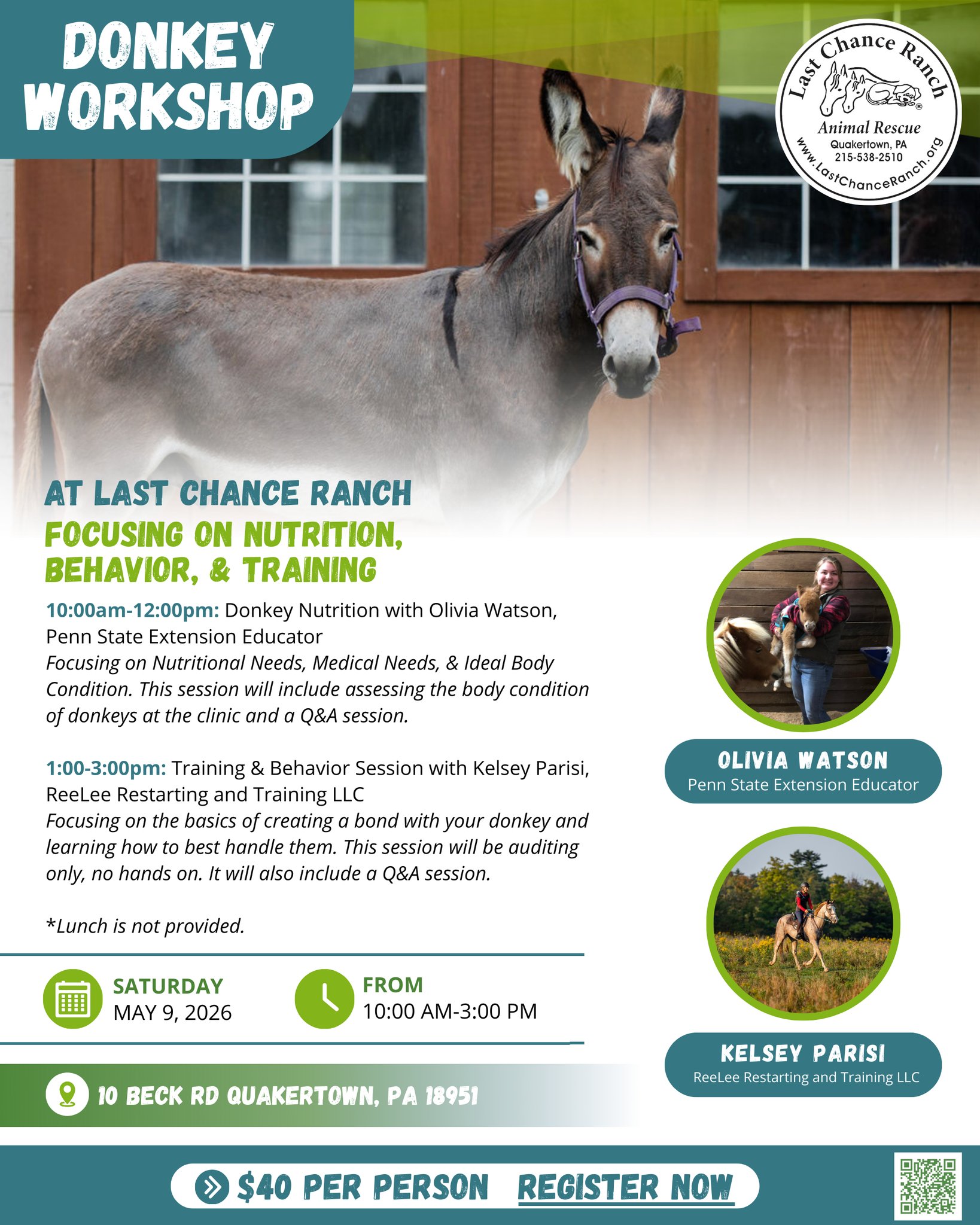 May 9 9:30 am - 3:00 pm Donkey Workshop @ LCR! Last Chance Ranch 10 Beck Road, Quakertown Event Details Get Directions