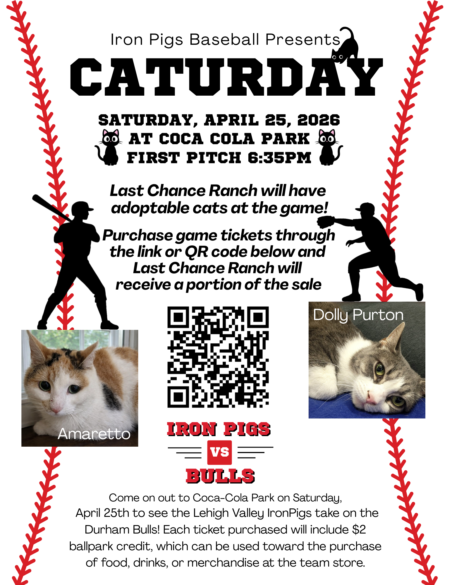 PLAY BALL… AND MEET YOUR NEW BEST FRIEND! Mark your calendars for Saturday, April 25, 2026 and join us at Coca-Cola Park for a purr-fect night out with the Lehigh Valley IronPigs! Last Chance Ranch will be at the game with adoptable cats ready to steal hearts (and maybe a little of the spotlight). When you purchase your tickets through ...